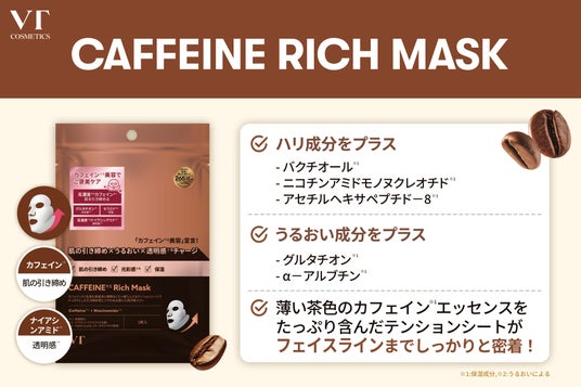 韓国発のスキンケアブランドVT COSMETICSは、乾燥した肌にハリと透明感※1を与える「カフェイン リッチマスク」を、2026年3月1日(日)より全国のPLAZA*・shop inにて順次先行発売いたします。カフェイン※2とナイアシンアミド※2を組み合わせた成分配合で、キュッと引き締まった理想の肌印象をサポートします。