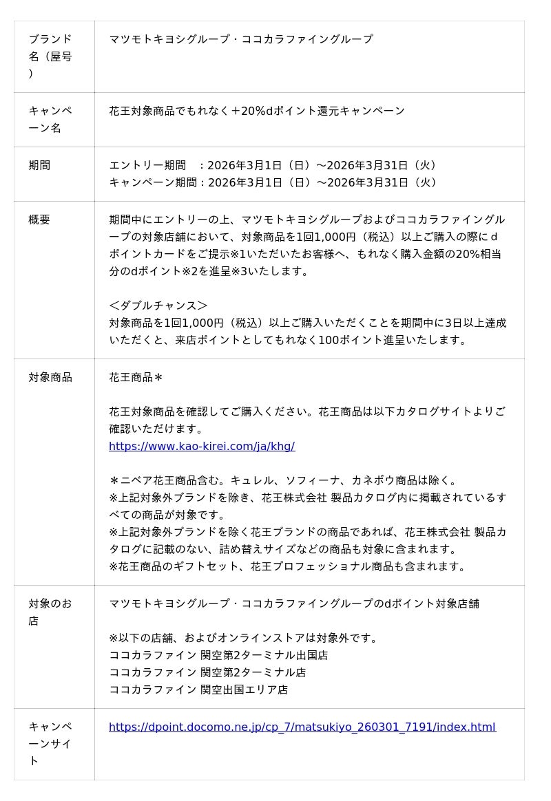 株式会社NTTドコモ(以下、ドコモ)は、全国のマツモトキヨシグループ・ココカラファイングループの対象店舗において、「花王対象商品でもれなく+20%dポイント還元キャンペーン(以下、本キャンペーン)」を2026年3月1日(日)から2026年3月31日(火)まで開催いたします。