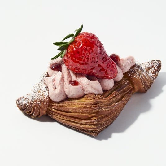 いちごショコラクイニーアマン ¥389ココアクロワッサン生地に、ビターチョコとあまおうイチゴを包み焼き上げ、ホイップと国産いちごをトッピング。