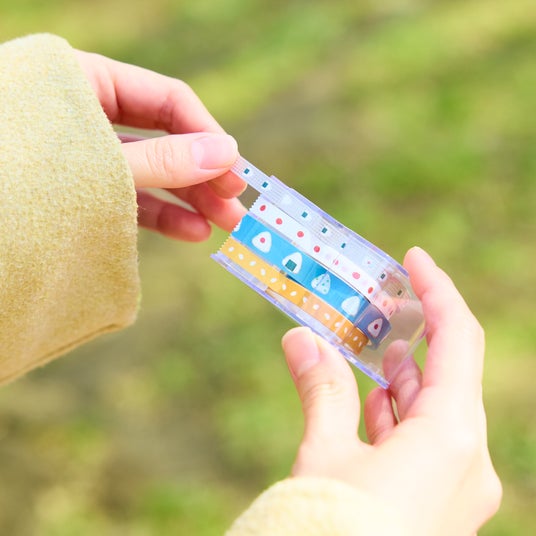 手帳やメッセージカードを彩るのにぴったりな、細身のマスキングテープです。ほっこりする素朴な「おにぎり」のイラストに金箔をあしらい、上品なアクセントを効かせています。付属の専用ケースは持ち運びに便利なコンパクトサイズ。お気に入りの別のテープに詰め替えて使うこともできる、優れものです。
