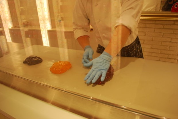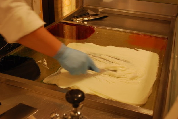左が、練られて空気が入ったアメ。こんなに色が変わります!!