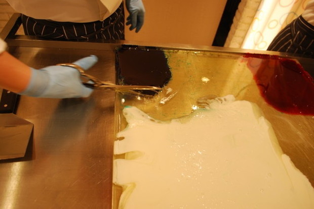 4ヵ所に色分けされたアメをハサミでカットしていきます。