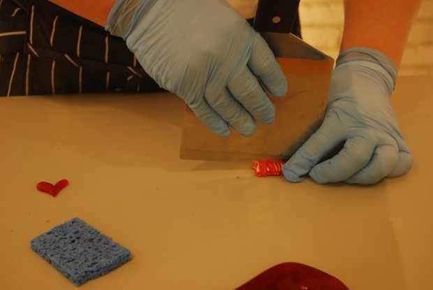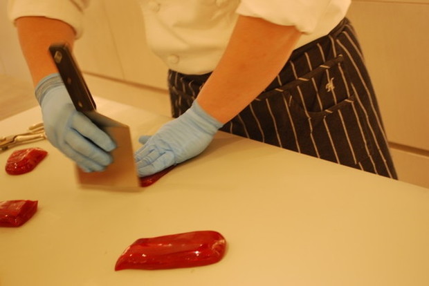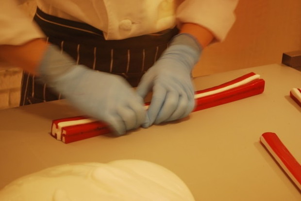 作った文字を並べて、更に白いキャンディーで包むと、まるで枕のような大きなアメの塊ができます。