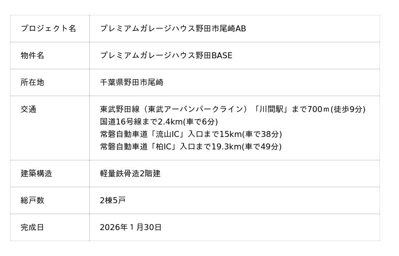 「まちのスキマを、『創造』で満たす。」というパーパスを掲げる、フィル・カンパニーグループ(中核企業:株式会社フィル・カンパニー 代表:外山晋吾 グループ本社:東京都中央区 以下、当グループ)は、2026年1月にプレミアムガレージハウス野田市尾崎(物件名:プレミアムガレージハウス野田BASE)が完成したことをお知らせいたします。