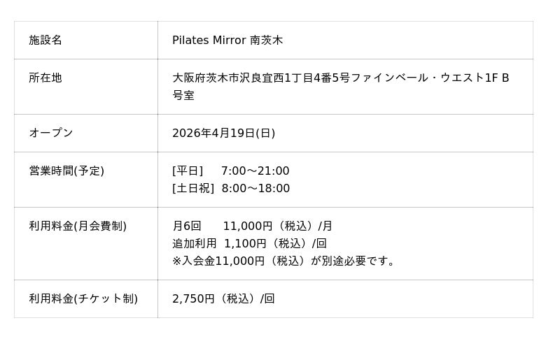 「Pilates Mirror 南茨木(大阪府茨木市)」「Pilates Mirror 庄内(大阪府豊中市)」
