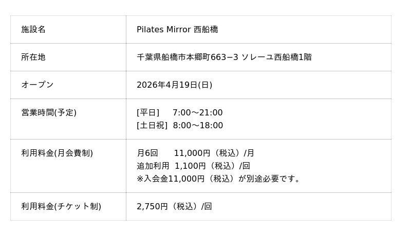 コナミスポーツ株式会社(以下、「弊社」)は、2026年4月に、天井にミラーを設置したマシンピラティススタジオ「Pilates Mirror」を大阪府茨木市・大阪府豊中市・千葉県船橋市・神奈川県川崎市に4店舗オープンします。また、今回初めて千葉県内に出店します。