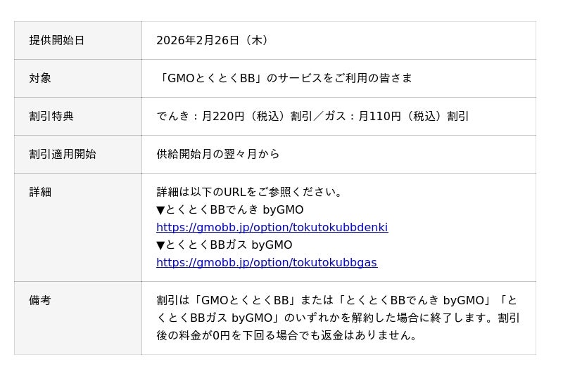 GMOインターネットグループの、GMOインターネット株式会社(代表取締役 社長執行役員:伊藤 正 以下、GMOインターネット)が提供するおトクなプロバイダーサービス「GMOとくとくBB」(URL:https://gmobb.jp/)は、2026年2月26日(木)より新たなインフラサービスとして「とくとくBBでんき byGMO」「とくとくBBガス byGMO」の提供を開始しました。