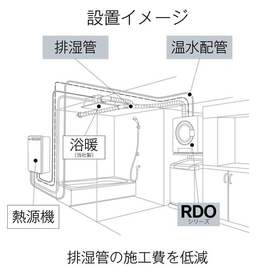 「RDO」シリーズは、ガス給湯暖房機の温水を温風に変えて、ドラム内の衣類を乾燥します。衣類乾燥時の水蒸気を排出する排湿管は、スパイラル管など空調設備で一般的な材料が選択できる他、当社製ガス温水式浴室暖房乾燥機(以下、浴暖)との組み合わせにおいて、浴暖の排気ダクトへの合流が可能な場合、施工費の低減が見込めます。