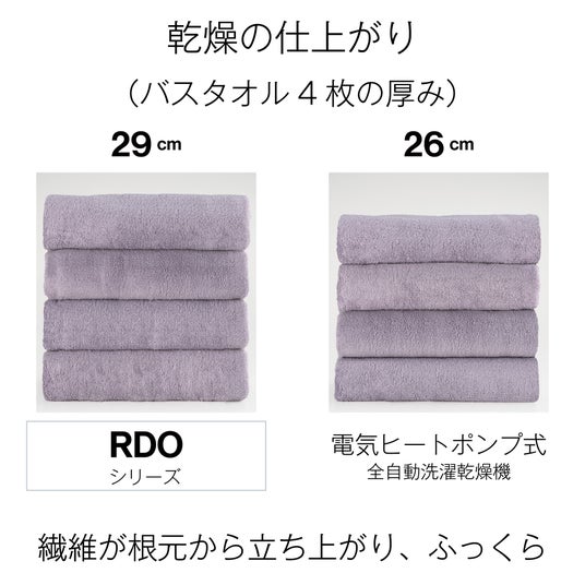 「RDO」シリーズなら、ガスで沸かした温水をパワフルな温風に変換することで、衣類6kgを約84分、電気ヒートポンプ式の半分以下の時間で乾燥します*3 。繊維が根元から立ち上がり、ガス衣類乾燥機と同じく仕上がりもふっくらです。