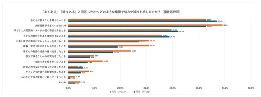具体的な場面として最も多かったのは「子どもが言うことを聞かないとき」(57.0%)でした。次いで「夫婦関係がうまくいかないとき」(52.9%)、「子どもの人間関係やメンタル面が心配なとき」(42.1%)が続きました。