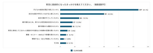 育児に意欲的になったきっかけとして最も多かったのは「子どもの成長を間近で感じたいから」(81.1%)でした。次いで「自分の成長や学びにつながると感じたから」(45.5%)が続きました。