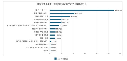育児についての相談相手として最も多かったのは「妻(パートナー)」(82.6%)でした。次いで「両親(実母・実父)」(31.8%)、「職場の同僚・上司」(25.8%)が続きました。