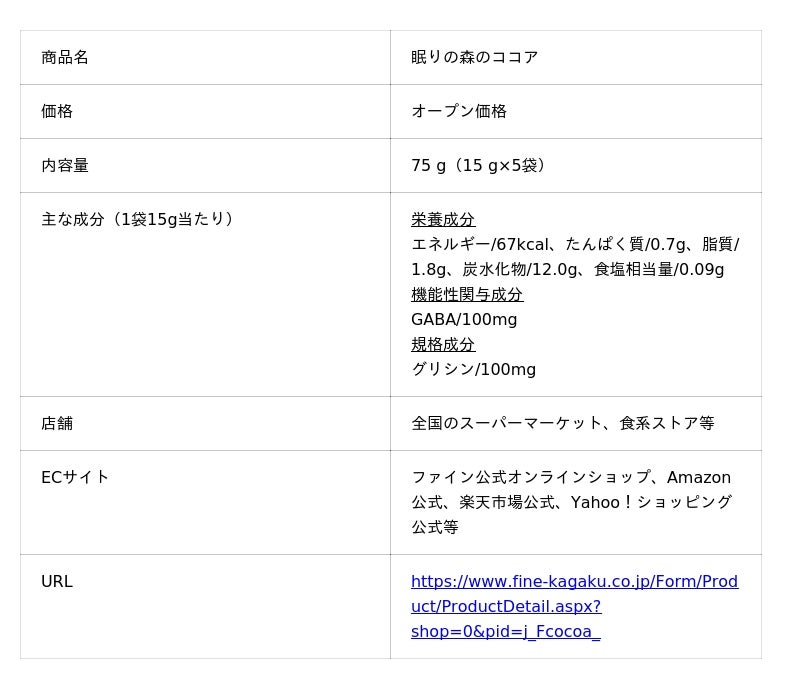 「睡眠に悩みはあるもののサプリメントに苦手意識がある」「中々睡眠ケアが続かない」など、眠りの質を向上させたい人のためのGABA配合ココアです。爽やかな毎日をサポートすべく、 ストレスを和らげ※1睡眠の質※2(眠りの深さ、すっきりとした目覚め)を向上させる成分「GABA※3」を100mg、休息サポート成分「グリシン」を100mgを配合しました。ホットミルクやお湯と混ぜて美味しく睡眠ケアができるのが特徴です。