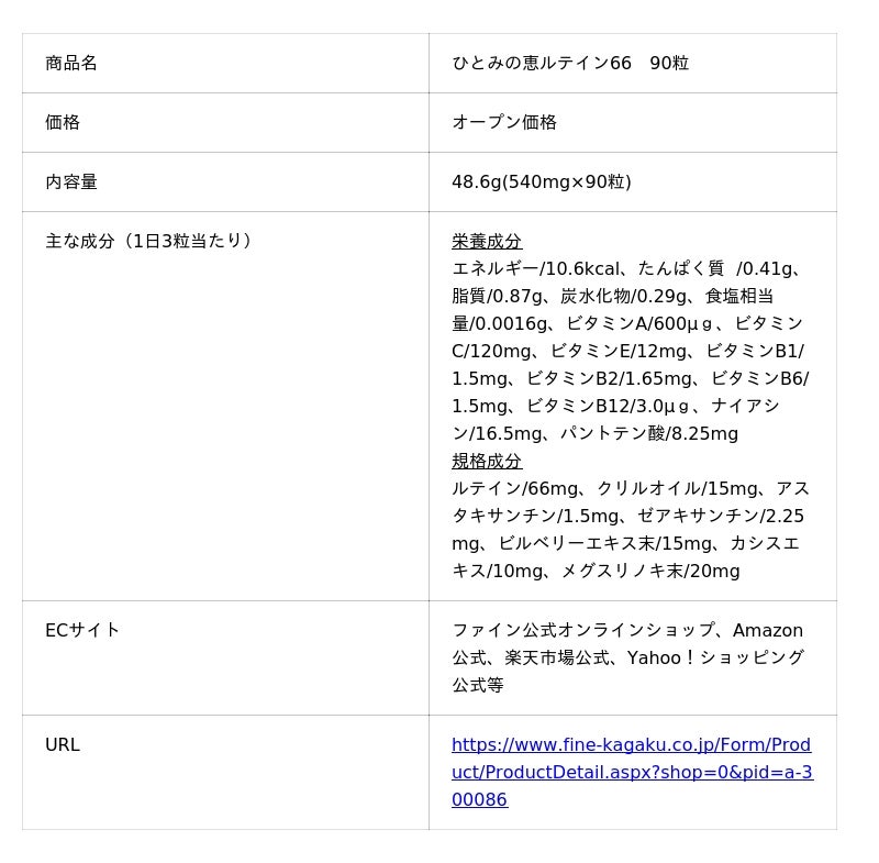 ひとみの恵ルテイン66は、体内に存在するルテインと同じ“フリー体ルテイン”を業界屈指の配合量で配合。摂取後はそのまま体に吸収されるため、効率的にルテインを届けます。