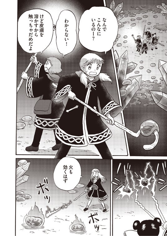 ▲『ビットとラチェの魔法学校』より。楽しい課外授業のはずが、スライムの大群に遭遇して大ピンチに! 魔力の少ないビットは知恵をしぼる