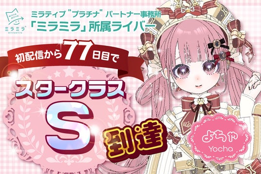 OTAGROUP株式会社(代表取締役:下西 竜二)はスマホ画面共有型ゲーム配信プラットフォーム「Mirrativ」パートナー事務所「ミラミラ」に所属するライバー「よちゃ」が初配信から77日目でスタークラスSに到達したことをお知らせいたします。