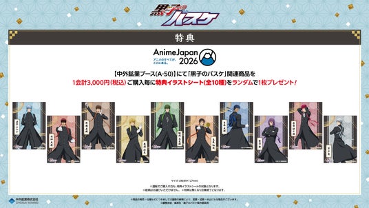 中外鉱業ブースにてTVアニメ「黒子のバスケ」AnimeJapan 2026関連商品を1会計3,000円(税込)ご購入毎に、特典イラストシート(全10種)をランダムで1枚プレゼントします。