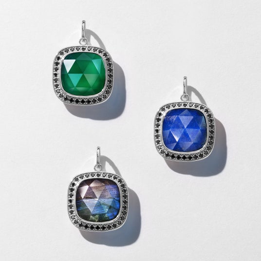 シルバーとブラックダイヤのコントラストが印象的な、存在感のあるデザイン。丸みを持たせた幾何学モチーフに、このジュエリーのためにカットした大粒カラーストーンを配し、力強さと品格を両立しました。ラピスラズリ、ラブラドライト、グリーンアゲートの3種の石を、リングとペンダントトップで展開。