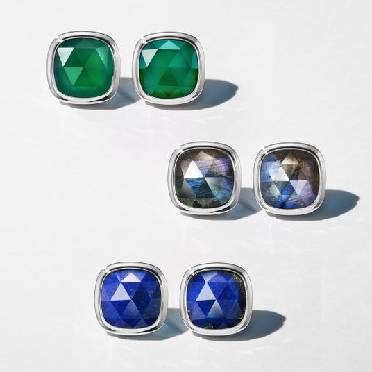 装飾をそぎ落とし、石そのものの色とカットを主役にしたミニマルなデザイン。丸みを帯びたスクエアモチーフと覆輪留めにより、ローズカットならではの表情を引き立てます。ラピスラズリ、ラブラドライト、グリーンアゲートの3種の石を、リングとピアスで展開。