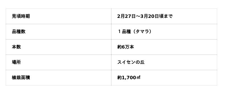 早咲きスイセンに続き3月下旬頃から、約1haの「スイセンガーデン」で、約100品種・約100万本のスイセンが見頃を迎える予定です。当公園のスイセンガーデンの魅力は、松林の中で咲く独特の景観にあります。柔らかな木漏れ日と白・黄色のスイセンが織りなす、幻想的な風景をご覧いただけます。そして、スイセンからチューリップ、ネモフィラ、バラへと続く、春の“フラワーリレー”をお楽しみください。