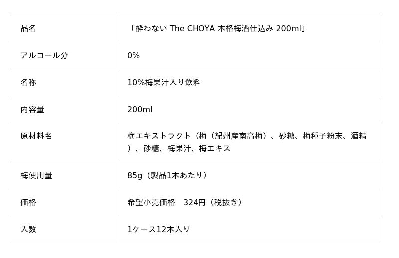 チョーヤ梅酒株式会社(本社:大阪府羽曳野市、社長:金銅重弘、以下チョーヤ)は、「酔わない The CHOYA 本格梅酒仕込み 700ml」のトライアルサイズ「酔わない The CHOYA 本格梅酒仕込み 200ml」を2026年3月10日(火)から全国にて新発売いたします。