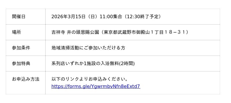 清掃活動後には、参加特典として系列施設にてサウナ・温浴を無料でご利用いただけます。