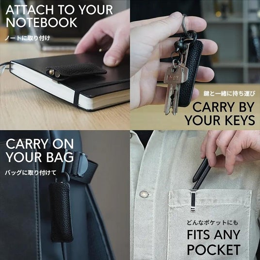オプションのレザースリーブを使えば、手帳やキーリングに取り付け可能。