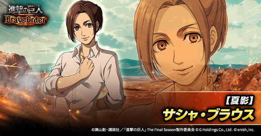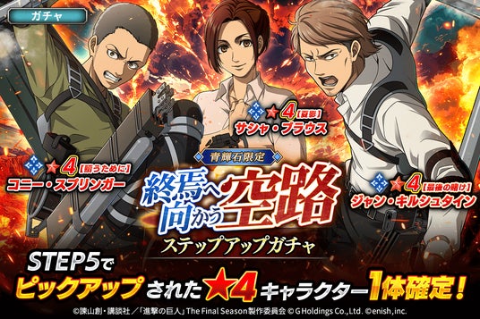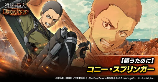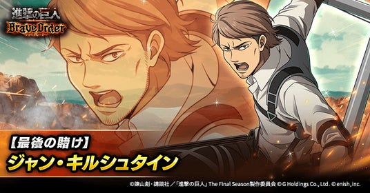 株式会社enish(本社:東京都港区、代表取締役社長:安徳 孝平、以下enish)は、アニメ『進撃の巨人』のスマートフォンゲーム最新作「進撃の巨人Brave Order」にて、2026年2月27日(金)より、新イベントの終焉へ向かう空路を開催!また、本日より【最後の賭け】ジャン・キルシュタイン、【贖うために】コニー・スプリンガー、【夏影】サシャ・ブラウスが登場する「終焉へ向かう空路ガチャ」も開催!その他、最新情報はゲーム公式サイト・ゲーム公式X(旧Twitter)アカウントにて随時公開して行きますので、ぜひご覧ください。