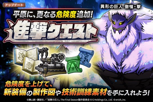 本日、2026年2月27日(金)に進撃クエストの平原に更なる危険度を追加!危険度を上げて、新装備の製作図や、技術訓練素材を手に入れよう!
