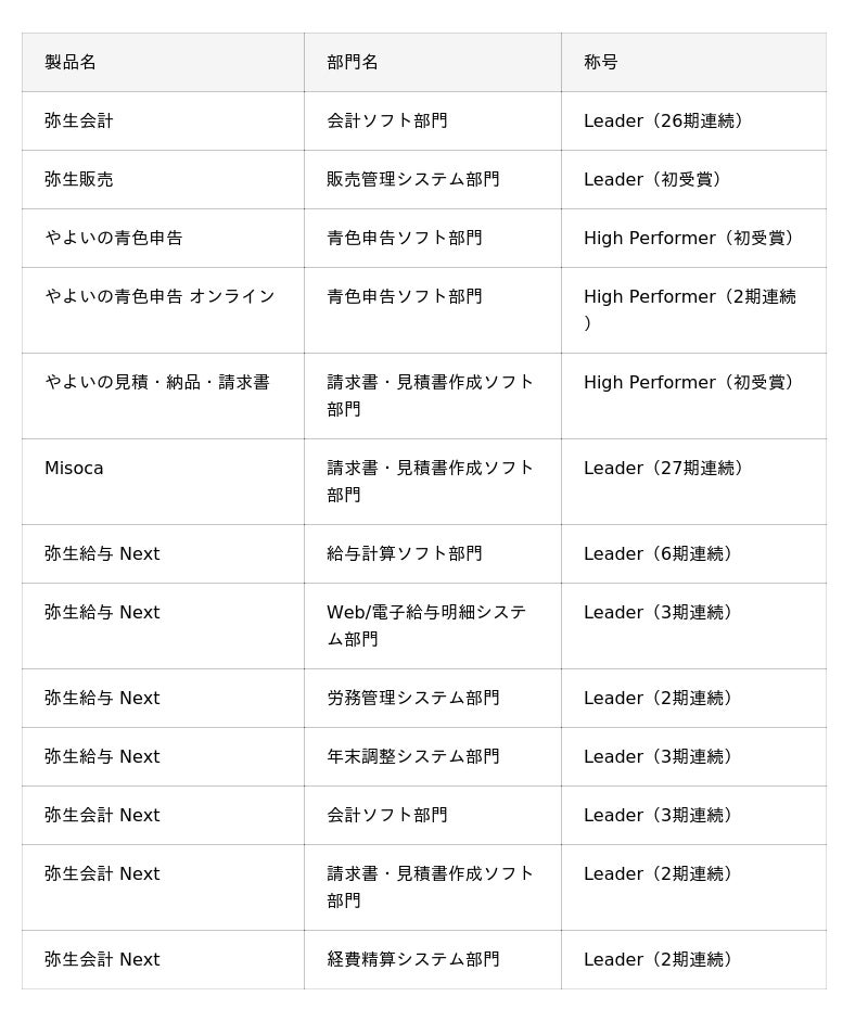 弥生製品は毎回複数の製品が受賞していますが、今回デスクトップソフトの「やよいの青色申告」「弥生販売」が初受賞いたしました。最新シリーズである「弥生会計 Next」および「弥生給与 Next」も、初受賞以降継続して「Leader」を受賞しており、ユーザーからの支持を着実なものとしています。今後も、デスクトップソフトとクラウドサービスの垣根なく、引き続きユーザーに満足いただけるよう提供価値の向上に努めてまいります。