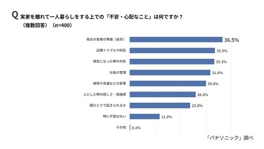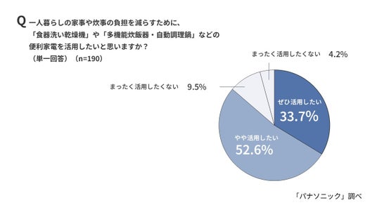《一人暮らしの不安として「毎日の食事の準備」が3割以上で最多。その解決策として「食器洗い乾燥機」や「自動調理鍋」などの便利家電を活用したい意向は8割以上に達し、「不慣れな家事は家電でカバーしたい」という合理的な意識がうかがえる》