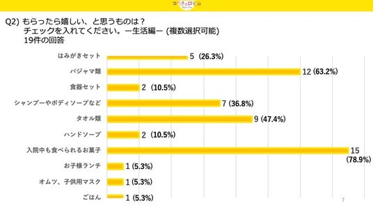 治療を支える大きな楽しみとして「お菓子」が最も高い人気を集めました。また、タオルやパジャマといった、衛生面や着心地を向上させる実用的なアイテムも重視されています。