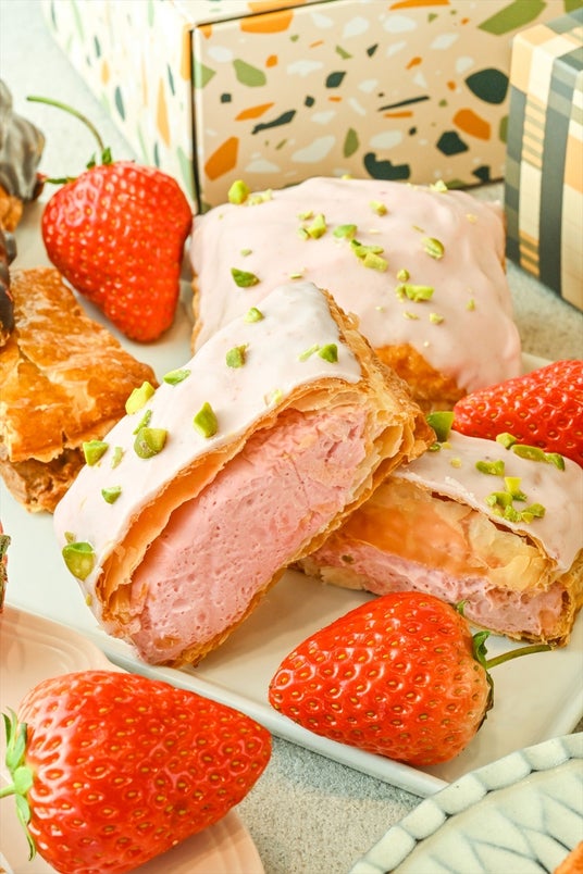 Butteryららぽーと安城の看板商品『ミルフィーユ』は、注文を受けてからその場でクリームを詰めるため、サクサクとした食感を存分に楽しむことができます。このたび3月1日(日)に新発売となるのは、春限定フレーバーとなる『イチゴミルフィーユ』。生クリームとカスタードクリームにいちごソースをあわせた“特製いちごクリーム”をたっぷりと絞り入れます。また、パイ生地をストロベリーチョコレートでコーティングし、仕上げに刻んだピスタチオをトッピング。まさに春の訪れを感じる、いちご尽くしの一品となっています。