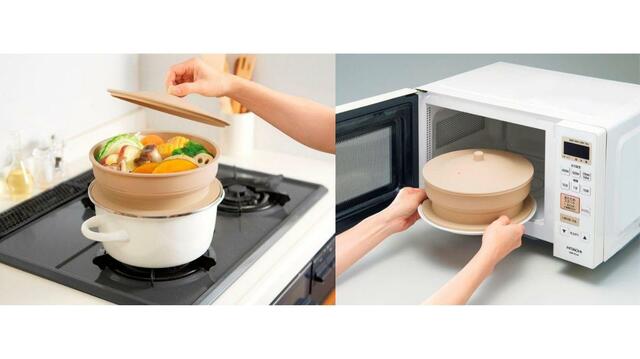 鍋で使う場合は直径18〜21cmの鍋にセットするだけ。電子レンジにも対応しているので、思い立ったときにすぐ蒸し料理を初められます。