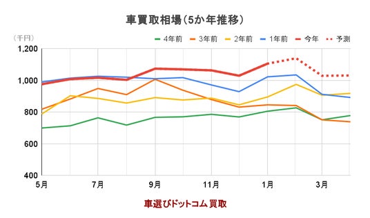 車選びドットコムが過去5年分のデータをもとに分析した通り、昨年の9月から10月かけて過去最高値を記録した買取相場は、年明けから記録を更新。平均買取価格は110万円を超えました。