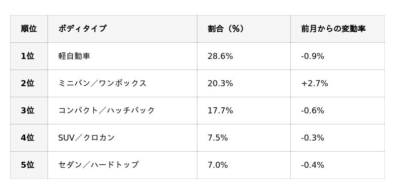 国産車ボディタイプ別買取ランキングは、前月と変わらず軽自動車が1位。割合はミニバン/ワンボックスが増加した影響で、他車種が減少傾向です。買取ランキングは、市場全体の割合を反映しているもので、しばらく順位が大きく変動することはないでしょう。