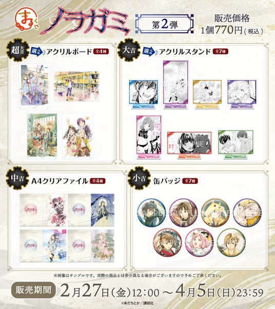今回のまるくじ『ノラガミ』第2弾では、美麗な原作イラストの素材を使用した、オリジナルグッズをご用意しました! 各賞の商品といたしましては、選べるアクリルボード、アクリルスタンド、A4クリアファイルなど、ファンの皆様に喜んでいただけるラインナップとなっております。