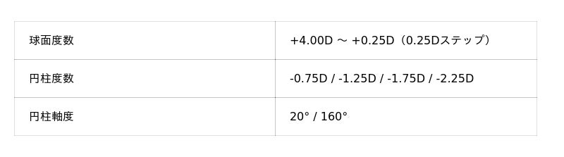 これまで提供してきた、より一般的でニーズの高い円柱度数90°および180°に加え、このたび円柱軸度20°、160°をラインナップに追加いたします。