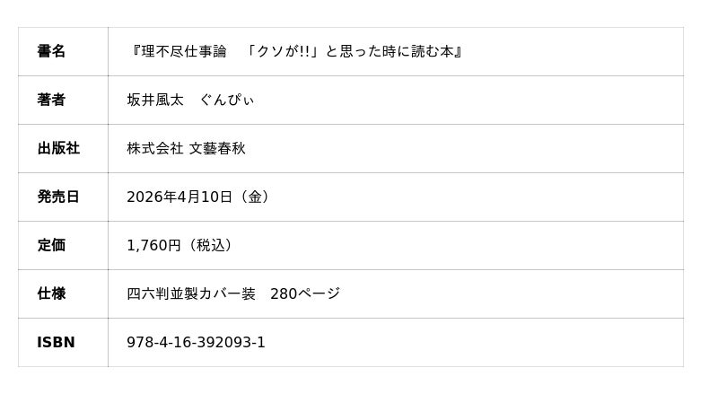 プロシューマー支援事業を展開する株式会社ファンコミュニケーションズ(本社:東京都渋谷区、代表取締役社長:二宮幸司 東京証券取引所プライム市場:2461)が運営する、国内最大級のお笑いラジオアプリ「GERA(ゲラ)」は、同アプリ発のPodcast特番『LAUGH & BIZ - 笑える理不尽ビジネス論-』のトークを再構成したビジネス書『理不尽仕事論 「クソが!!」と思った時に読む本』(著:坂井風太・ぐんぴぃ、株式会社文藝春秋)を2026年4月10日(金)に文藝春秋より出版することが決定いたしました。
