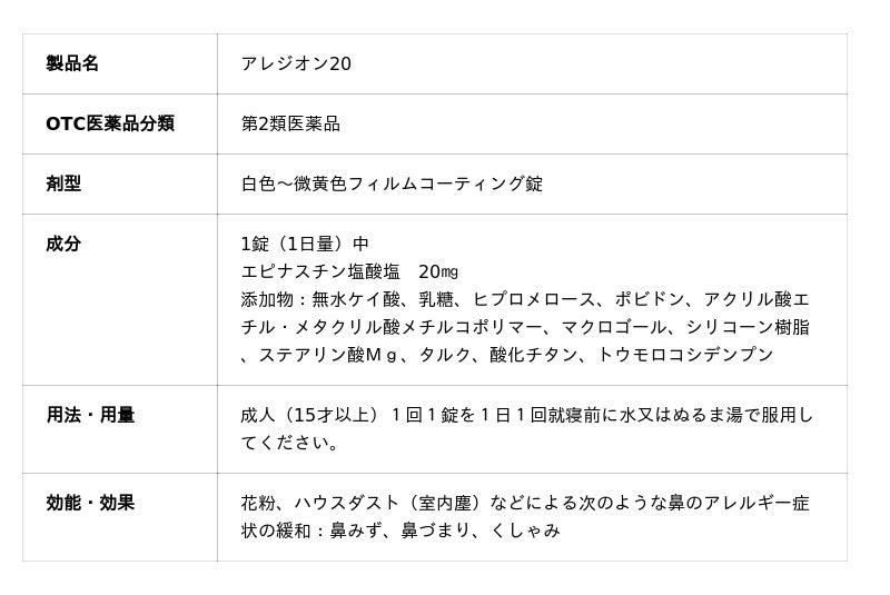 「アレジオン20」(第2類医薬品)は、持続性有効成分エピナスチン塩酸塩を20mg配合したアレルギー専用鼻炎薬です。第2世代の抗ヒスタミン薬で、眠くなりにくい※という大きな特徴を持っているほか、1日1回1錠の服用で手間をかけずに鼻炎症状のケアを行うことができます。※服用後は、乗り物または機械類の運転操作をしないでください。