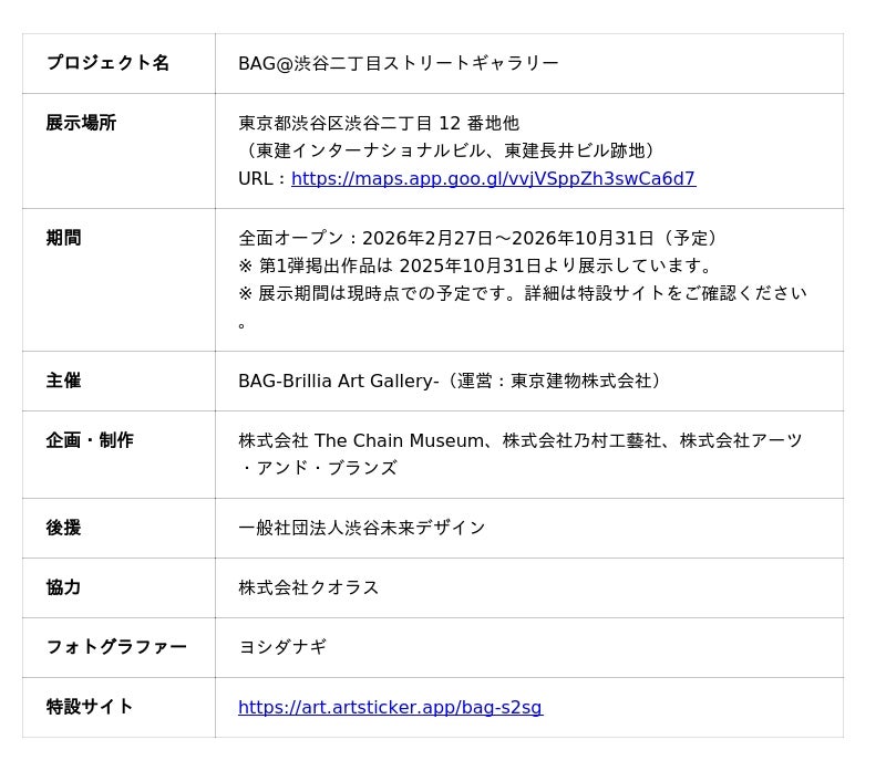 株式会社The Chain Museum(本社:東京都渋谷区、代表取締役 遠山 正道)は、東京建物株式会社(本社:東京都中央区、代表取締役 社長執行役員 小澤 克人)が運営する「BAG-Brillia Art Gallery-」(バッグ ブリリア アートギャラリー)による、解体工事が進む渋谷の工事現場仮囲いを展示空間へと変換する「BAG@渋谷二丁目ストリートギャラリー」(以下「本プロジェクト」)の企画・制作を担当し、2026年2月27日より全面オープンします。