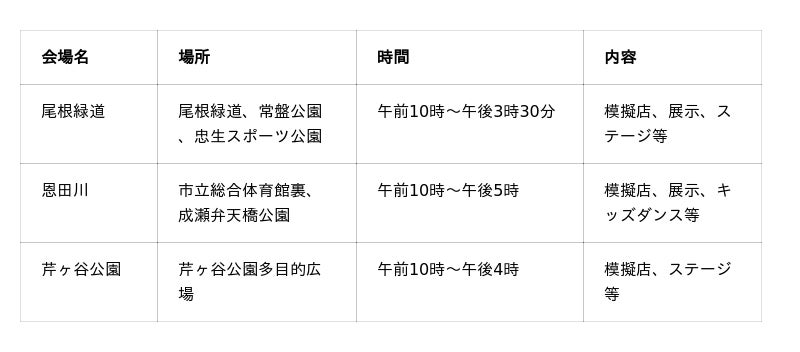 町田さくらまつりメイン3会場(下表参照)では、飲食の模擬店やステージを用意しています。