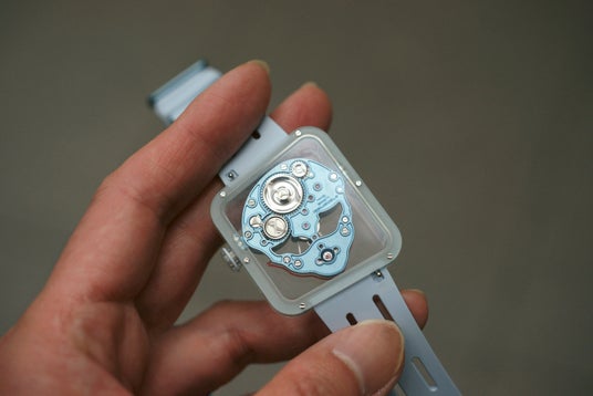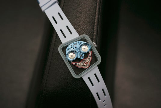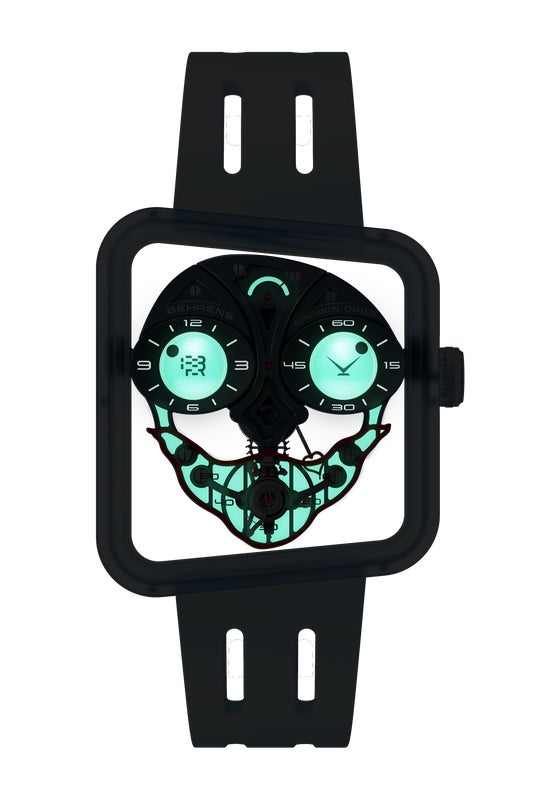 このキャリバーには業界をリードする11 もの特許技術が採用されています。秒針は前作同様ベーレンスが特許取得済みの石臼式機械技術を採用、ハート型の外周に沿うように独特の軌道を描きます。左右の眼はそれぞれ「時」と「分」を表示し、額にはパワーリザーブ表示が追加されました。ベーレンスでは素材開発にも注力しており、この新しい限定コレクションでは3 種類の異なる素材を採用しています。