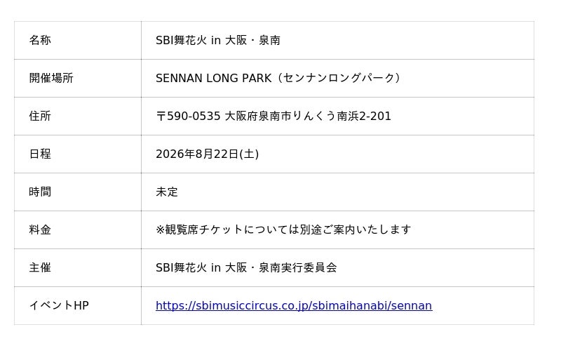 株式会社SBI MUSIC CIRCUS(本社:東京都港区、代表取締役社長:大付 楽洋、以下「当社」)は、2026年8月22日(土)、SENNAN LONG PARK(センナンロングパーク)にて「SBI 舞花火 in 大阪・泉南」を開催することをお知らせいたします。