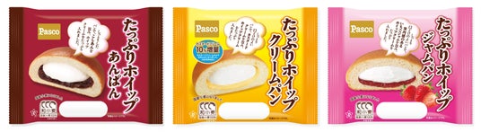 敷島製パン株式会社(Pasco)は「たっぷりホイップあんぱん」「たっぷりホイップクリームパン」「たっぷりホイップジャムパン」を、2026年3月1日(日)より東北・関東・中部・関西・中国・四国・九州地区にてリニューアル発売します。