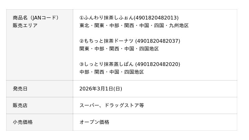 敷島製パン株式会社(Pasco)は、"抹茶企画"として「ふんわり抹茶しふぉん」「もちっと抹茶ドーナツ」「しっとり抹茶蒸しぱん」の3アイテムを、2026年3月1日(日)より東北、関東、中部、関西、中国、四国、九州地区(*1)にて発売します。