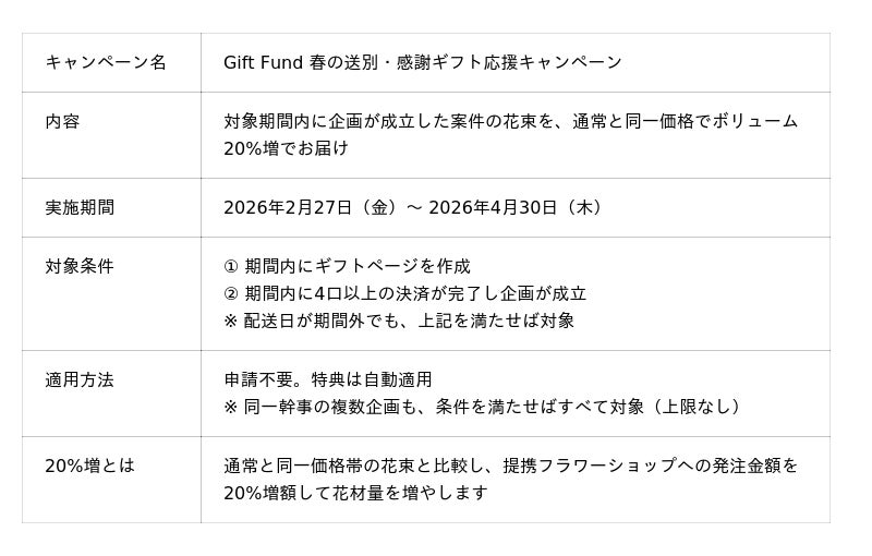 こうした課題を解決するために生まれたオンライングループギフトサービス「Gift Fund」は、春の送別シーズンに合わせて「春の送別・感謝ギフト応援キャンペーン」を2026年2月27日(金)より開始します。