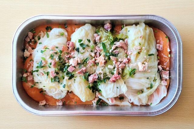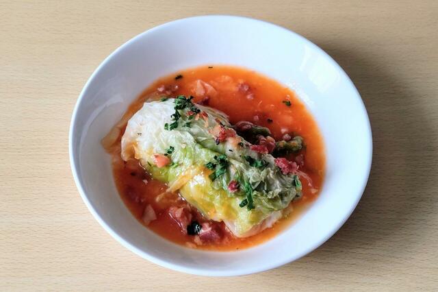 加熱後、オーブンから取り出すと、ペースト状だったトマトスープが溶けてロールキャベツに染み込んでいました。その上に散りばめられたベーコンとパセリが彩りを添えていますね。