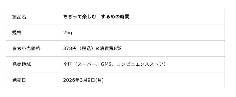 株式会社なとり(本社:東京都北区 会長兼社長:名取三郎)は、「ちぎって楽しむ するめの時間」を3月9日(月)より新たに発売いたします。