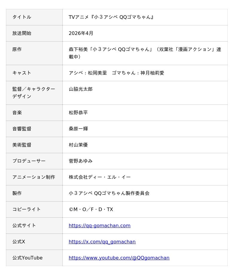 株式会社ディー・エル・イー(東京都千代田区、代表取締役社長CEO・CCO 小野亮、以下DLE)がオルタナティブ・アニメでアニメーション制作を担当するTVアニメ『小3アシベ QQゴマちゃん』(原作:森下裕美「漫画アクション」連載/双葉社)のキービジュアルが公開されました。本作は2026年4月より放送開始予定です。